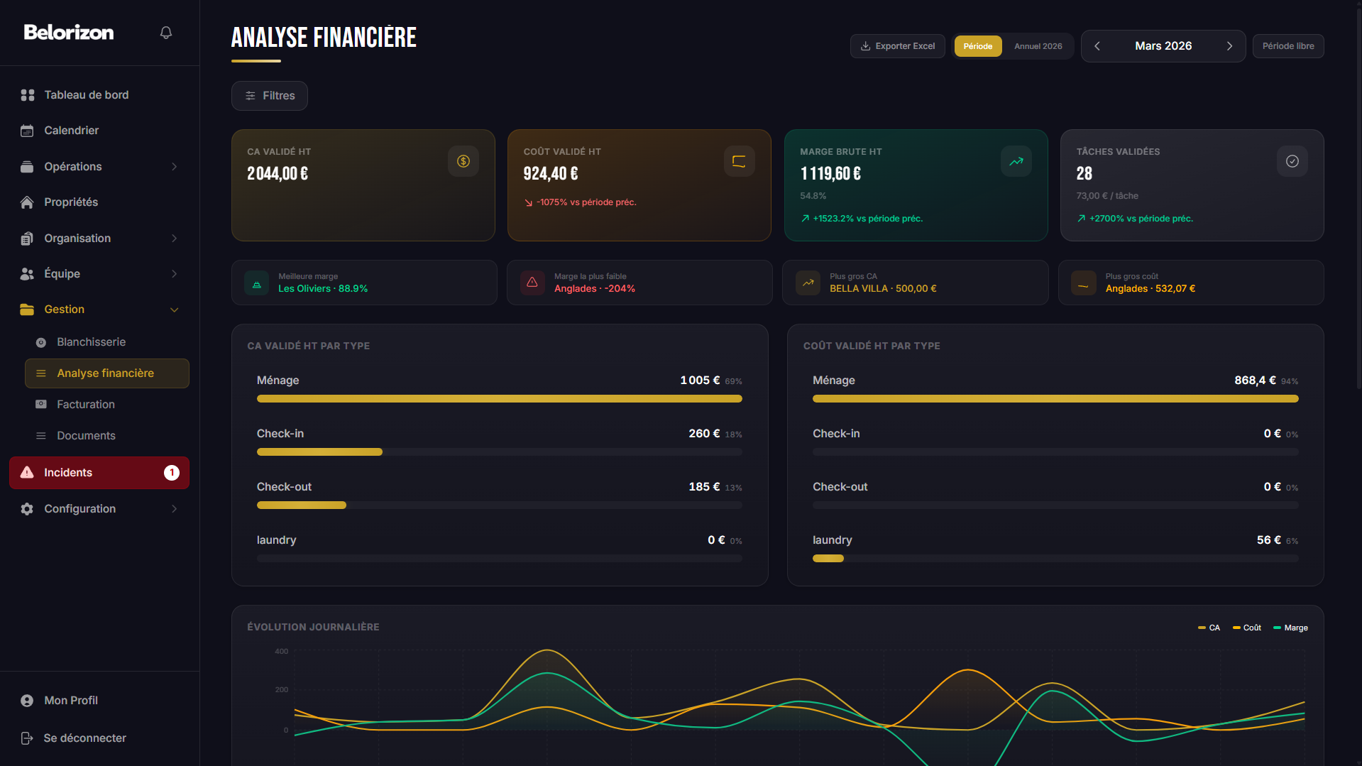 Chiffre d'affaires, coûts, rentabilité — visibilité complète par logement.
